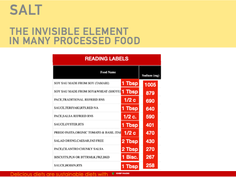 SALT THE INVISIBLE ELEMENT IN MANY PROCESSED FOOD READING LABELS 1 Tbsp 1 Tbsp 1/2 c 1 Tbsp 1/2 c. 1 Tbsp 1/2 c 2 Tbsp 2 Tbsp 1 Bisc. Delicious diets are sustainable diets with 1 Tbsp 1005 879 690 640 590 401 470 430 270 267 258 Patricia McCausland-Gallo, CCP YouTube Pachigallo