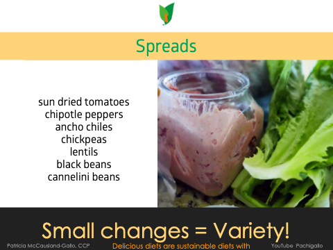 Spreads sun dried tomatoes chipotle peppers ancho chiles chickpeas lentils black beans cannelini beans Spreads Small changes = Variety! Patricia McCausland-Gallo, CCP Delicious diets are sustainable diets with YouTube Pachigallo
