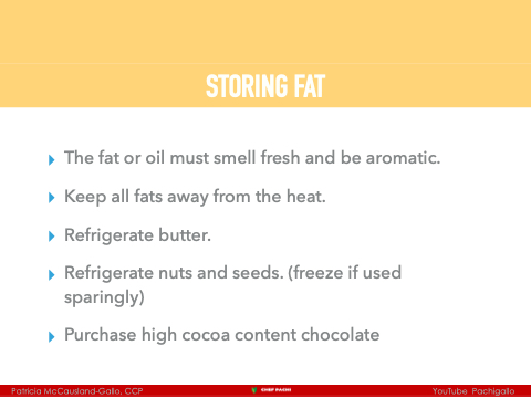 STORING FAT ▸ ▸ ▸ ▸ ▸ The fat or oil must smell fresh and be aromatic. Keep all fats away from the heat. Refrigerate butter. Refrigerate nuts and seeds. (freeze if used sparingly) Purchase high cocoa content chocolate Patricia McCausland-Gallo, CCP YouTube Pachigallo