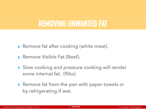 REMOVING UNWANTED FAT ▸ ▸ ▸ ▸ Remove fat after cooking (white meat). Remove Visible Fat (Beef). Slow cooking and pressure cooking will render some internal fat. (Ribs) Remove fat from the pan with paper towels or by refrigerating if wet. Patricia McCausland-Gallo, CCP YouTube Pachigallo