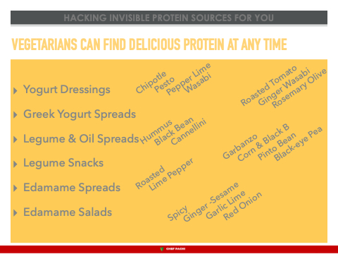 HACKS HACKING INVISIBLE PROTEIN SOURCES FOR YOU VEGETARIANS CAN FIND DELICIOUS PROTEIN AT ANY TIME ▸ ▸ ▸ ▸ ▸ ▸ Yogurt Dressings Greek Yogurt Spreads Legume & Oil Spreads Legume Snacks Edamame Spreads Edamame Salads Patricia McCausland-Gallo, CCP YouTube Pachigallo Roasted Lime Pepper Rosemary Olive Spicy Ginger -Sesame Garbanzo Corn & Black B Chipotle Pesto Hummus Black Bean Cannellini Roasted Tomato Ginger Wasabi Garlic Lime Red Onion Pinto Bean Black-eye Pea Pepper Lime Wasabi