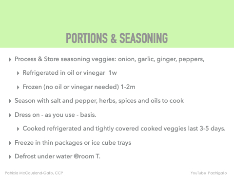 PORTIONS & SEASONING ▸ ▸ ▸ ▸ ▸ ▸ ▸ ▸ Process & Store seasoning veggies: onion, garlic, ginger, peppers, Refrigerated in oil or vinegar 1w Frozen (no oil or vinegar needed) 1-2m Season with salt and pepper, herbs, spices and oils to cook Dress on - as you use - basis. Cooked refrigerated and tightly covered cooked veggies last 3-5 days. Freeze in thin packages or ice cube trays Defrost under water @room T. Patricia McCausland-Gallo, CCP YouTube Pachigallo