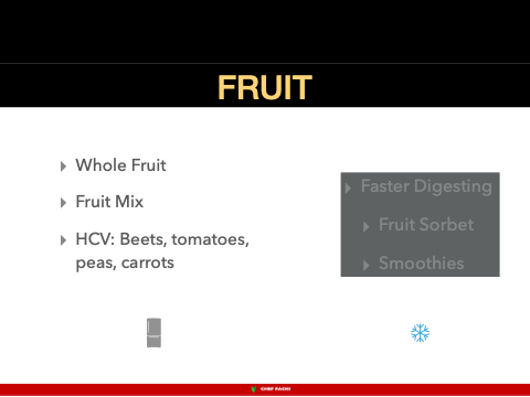 FRUIT ▸ ▸ ▸ Whole Fruit Fruit Mix HCV: Beets, tomatoes, peas, carrots ▸ ▸ ▸ Faster Digesting Fruit Sorbet Smoothies