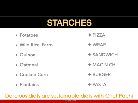 WHICH STARCH DO YOU LIKE? STARCHES ▸ ▸ ▸ ▸ ▸ ▸ Potatoes Wild Rice, Farro Quinoa Oatmeal Cooked Corn Plantains ✦ PIZZA ✦ WRAP ✦ SANDWICH ✦MAC N CH ✦ BURGER ✦ PASTA Delicious diets are sustainable diets with Chef Pachi Patricia McCausland-Gallo, CCP YouTube Pachigallo