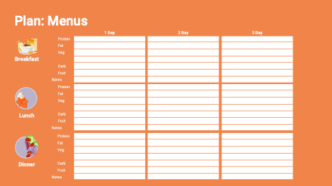 Plan: Menus Protein Fat Veg Carb Fruit Notes Protein Fat Veg Carb Fruit Notes Protein Fat Veg Carb Fruit Notes 1 Day 2 Day 3 Day Breakfast Lunch Dinner