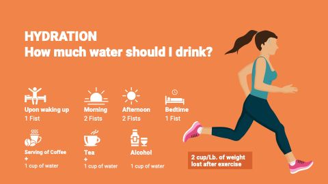 HYDRATION How much water should I drink? Upon waking up 1 Fist Serving of Coffee +1 cup of water Morning 2 Fists Tea +1 cup of water Afternoon 2 Fists Alcohol 1 cup of water Bedtime 1 Fist 2 cup/Lb. of weight lost after exercise