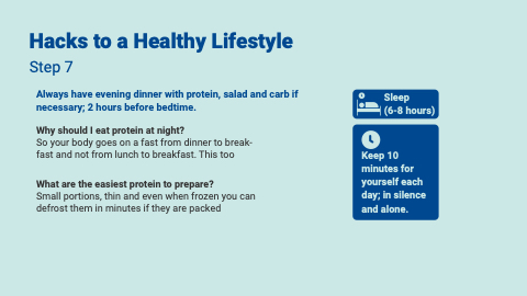 Always have evening dinner with protein, salad and carb if necessary; 2 hours before bedtime.