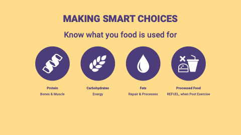 MAKING SMART CHOICES Know what you food is used for Protein Carbohydrates Fats Processed Food Bones & Muscle Energy Repair & Processes REFUEL, when Post Exercise