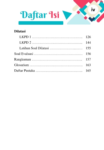 Daftar Isi iv Dilatasi LKPD 1 …………………………………….. 126 LKPD 2 …………………………………….. 144 Latihan Soal Dilatasi …………………..…… 155 Soal Evaluasi …………………………………… 156 Rangkuman …………………………………….. 157 Glosarium ………………………………………. 163 Daftar Pustaka ………………………………….. 165