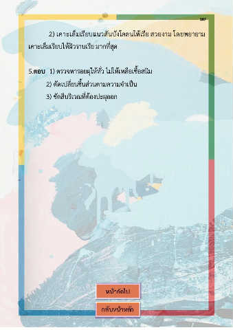 187 2) เคาะเล็มเรียบแนวสันบังโคลนให้เรีย สวยงาม โดยพยายาม เคาะเล็มเรียบให้ผิวราบเรีย มากที่สุด 5.ตอบ 1) ตรวจหารอยผุให้ทั่ว ไม่ให้เหลือเชื้อสนิม 2) ตัดเปลี่ยนชิ้นส่วนตามความจําเป็น 3) ขัดสีบริเวณที่ต้องปะผุออก