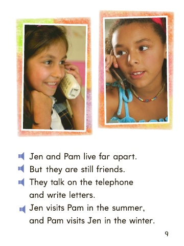 Jen and Pam live far apart. But they are still friends. They talk on the telephone and write letters. Jen visits Pam in the summer, and Pam visits Jen in the winter. 9