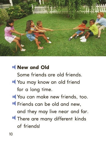 New and Old Some friends are old friends. You may know an old friend for a long time. You can make new friends, too. Friends can be old and new, and they may live near and far. There are many different kinds of friends! 10