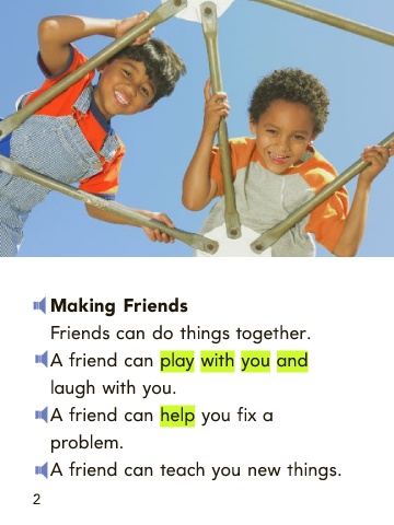 Making Friends Friends can do things together. A friend can play with you and laugh with you. A friend can help you fix a problem. A friend can teach you new things. 2