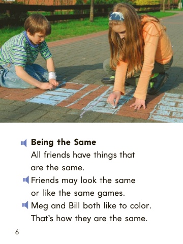 Being the Same All friends have things that are the same. Friends may look the same or like the same games. Meg and Bill both like to color. That’s how they are the same. 6