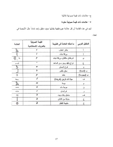 ج -ﻋﻼﻣﺎت ذات ﻗﯾﻣﺔ ﺻوﺗﯾﺔ ﺛﻼﺛﯾﺔ -٥ﻋﻼﻣﺎت ذات ﻗﯾﻣﺔ ﺻوﺗﯾﺔ ﻣﻔردة "ﺗﺟد ﻓﻲ ﻫذﻩ اﻟﻘﺎﺋﻣﺔ أن ﻛل ﻋﻼﻣﺔ ﻫﯾروﻏﻠﯾﻔﯾﺔ ﯾﻘﺎﺑﻠﻬﺎ ﺣرف ﻧطق واﺣد ﺗﻣﺎﻣﺎً ﻣﺛل اﻷﺑﺟدﯾﺔ ﻓﻲ ﻟﻐﺗﻧﺎ. 17