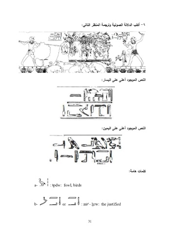 -٦أﻛﺗب اﻟدﻻﻟﺔ اﻟﺻوﺗﯾﺔ وﺗرﺟﻣﺔ اﻟﻣﻧظر اﻟﺗﺎﻟﻲ: اﻟﻧص اﻟﻣوﺟود أﻋﻠﻰ ﻋﻠﻰ اﻟﯾﺳﺎر: اﻟﻧص اﻟﻣوﺟود أﻋﻠﻰ ﻋﻠﻰ اﻟﯾﻣﯾن: ﻛﻠﻣﺎت ﻫﺎﻣﺔ: a- : Apdw: fowl, birds b- or : mAa- xrw: the justified 31