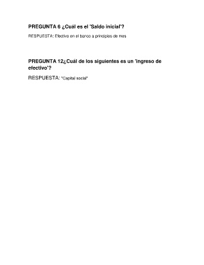 PREGUNTA 6 ¿Cuál es el 'Saldo inicial'? RESPUESTA: Efectivo en el banco a principios de mes ? PREGUNTA 12¿Cuál de los siguientes es un 'ingreso de efectivo'? RESPUESTA: "Capital social"