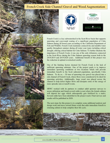 French Creek is a key subwatershed in the Scott River basin that supports spawning and year-round rearing of a significant population of Coho Salmon during all brood years according to the California Department of Fish and Wildlife. French Creek maintains connectivity and suitable water quality throughout summer during all water year types including critical drought, offering critical habitat for Coho Salmon. To further illustrate the importance of French Creek, it was one of the only tributaries connected to the Scott River during the Coho Salmon spawning season both in the 2018/2019 and 2019/2020 years. Additional benefit of this project was the reduction in upland overstocked conifer.
