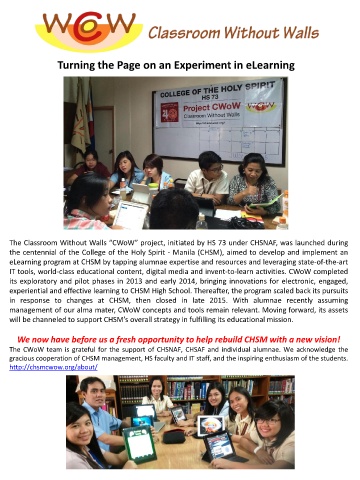 The Classroom Without Walls “CWoW” project, initiated by HS 73 under CHSNAF, was launched during
