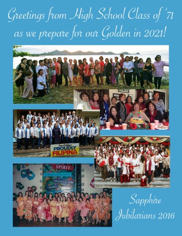 Greetings from High School Class of ‘71 as we prepare for our Golden in 2021! Sapphire Jubilarians 2016