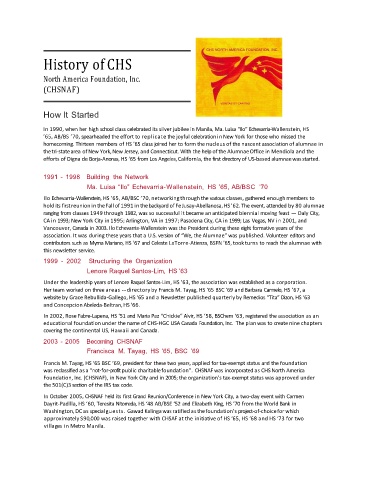 In 2002, Rose Fabre-Lapena, HS ‘51 and Maria Paz “Chickie” Alvir, HS ‘58, BSChem ‘63, registered the association as an