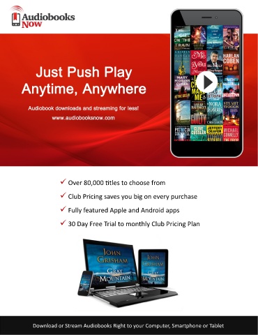 Over 80,000 tles to choose from Club Pricing saves you big on every purchase Fully featured Apple and Android apps 30 Day Free Trial to monthly Club Pricing Plan Download or Stream Audiobooks Right to your Computer, Smartphone or Tablet