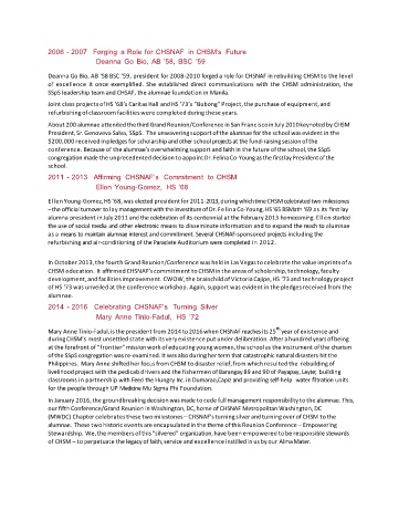 Deanna Go Bio, AB ‘58 BSC ‘59, president for 2008-2010 forged a role for CHSNAF in rebuilding CHSM to the level