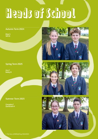 Heads of School Autumn Term 2024 Elsie S Will B Spring Term 2025 Ava C Bailey B Summer Term 2025 Georgina F Zachariah H e p 2 0 r e l d P 0 2 5 2 2 4 / fi T h e Y 2 The Year at Millfield Prep 2024/2025 2 2 i l l t M e a r a