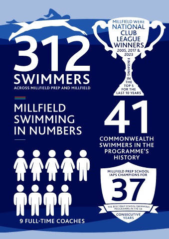 131 312 SWIMMERS 64 ACROSS MILLFIELD PREP AND MILLFIELD MILLFIELD 41 SWIMMING IN NUMBERS COMMONWEALTH SWIMMERS IN THE PROGRAMME’S HISTORY 31 THE BEST PREP SCHOOL SWIMMING PROGRAMME IN THE UK 9 FULL-TIME COACHES