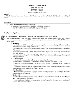 A PGA Professional seeking an Assistant Golf Professional position at Valhalla Golf Club for the 2019 golf