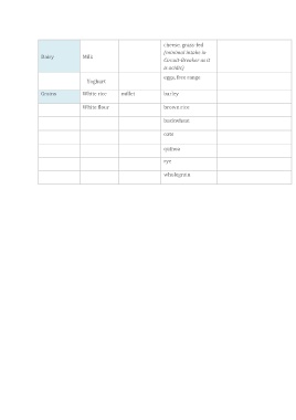 cheese, grass-fed (minimal intake in Dairy Milk Circuit-Breaker as it is acidic) eggs, free range Yoghurt Grains White rice millet barley White flour brown rice buckwheat oats quinoa rye wholegrain