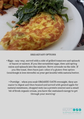 Page 2 - BREAKFAST OPTIONS• Eggs – any-way, served with a side of grilled tomatoes and spinach or bacon or salmon. If you like scrambled eggs, then add spring onion and spinach into the mixture. Serve avocado on the side. If you like toast, then have just 1 slice