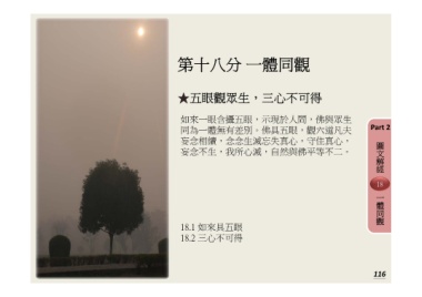 Part 2 圖文解經 18 一體同觀 116 一體同觀 ★五眼觀眾生,三心不可得 如來一眼含攝五眼,示現於人間,佛與眾生 同為一體無有差別。佛具五眼,觀六道凡夫 妄念相續,念念生滅忘失真心,守住真心, 妄念不生,我所心滅,自然與佛平等不二。 第十八分 18.1 如來具五眼 18.2 三心不可得