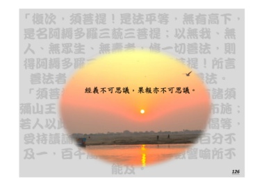 彌山王,如是等七寶聚,有人持用布施; 若人以此般若波羅蜜經,乃至四句偈等, 「復次,須菩提!是法平等,無有高下, 126 及一,百千萬億分,乃至算數譬喻所不 受持讀誦、為他人說,於前福德百分不 「須菩提!若三千大千世界中所有諸須 人、無眾生、無壽者,修一切善法,則 是名阿耨多羅三藐三菩提;以無我、無 得阿耨多羅三藐三菩提。須菩提!所言 善法者,如來說非善法,是名善法。 經義不可思議,果報亦不可思議。 能及。