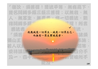 彌山王,如是等七寶聚,有人持用布施; 若人以此般若波羅蜜經,乃至四句偈等, 「復次,須菩提!是法平等,無有高下, 134 及一,百千萬億分,乃至算數譬喻所不 受持讀誦、為他人說,於前福德百分不 「須菩提!若三千大千世界中所有諸須 得阿耨多羅三藐三菩提。須菩提!所言 人、無眾生、無壽者,修一切善法,則 是名阿耨多羅三藐三菩提;以無我、無 善法者,如來說非善法,是名善法。 我應滅度一切眾生,滅度一切眾生已, 而無有一眾生實滅度者。 能及。