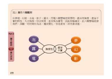 實的特性。凡夫執持一切法恆常,甚至執為實有,因此煩惱痛苦。此六種譬喻啟發 以夢境、幻術、水泡、影子,露水、閃電六種譬喻世間事物,都具有無常、虛妄不 我們,深觀一切世間有為法,遷流變化,皆是虛妄,終究會消逝。 夢 幻 影 虛妄 不實 無常性 泡 露 電 32.1 應作六種觀照 Part 2 圖文解經 32 應化非真 173