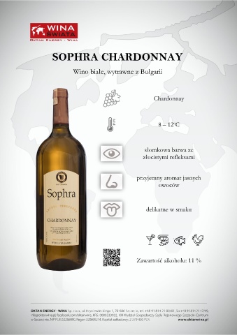 SOPHRA CHARDONNAY Wino białe, wytrawne z Bułgarii Chardonnay 8 – 12 C o słomkowa barwa ze złocistymi refleksami przyjemny aromat jasnych owoców delikatne w smaku Zawartość alkoholu: 11 %