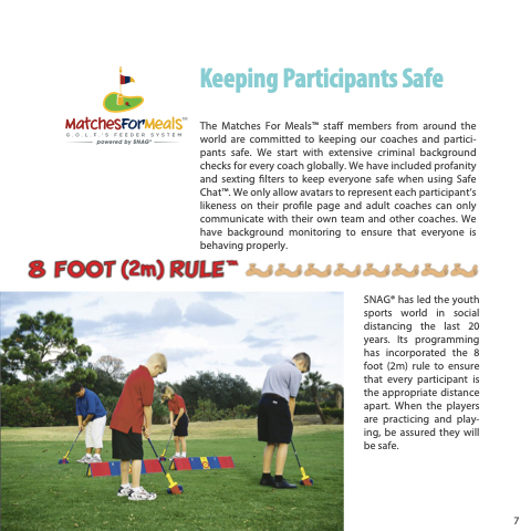 SNAG® has led the youth sports world in social distancing the last 20 years. Its programming has incorporated the 8 foot (2m) rule to ensure that every participant is the appropriate distance apart. When the players are practicing and play- ing, be assured they will be safe.