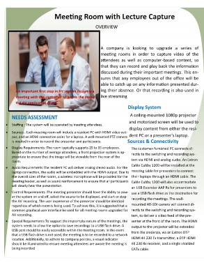 Sources : Each meeting room will include a resident PC with HDMI video out- cations, from basic switching system with a single display, all the way up to large scale AV distribu-