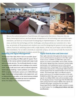in classrooms, lecture halls, and conference rooms vary, depending rooms, lecture halls, meeting rooms, and The Modular Fiber Optic Matrix Switcher provides signal Fiber optic extenders throughout the design connect