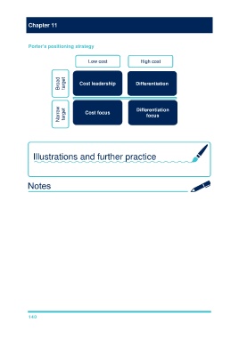 Chapter 11 Porter’s positioning strategy Low cost High cost Broad target Cost leadership Differentiation Narrow target Cost focus Differentiation focus Illustrations and further practice Now try TYU 1 from Chapter 11. 140