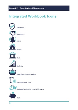 Subject E1: Organisational Management Integrated Workbook Icons Advantage Agreement Alarm Assets Bank Big Data Board/Board room/meeting Building/construction Business/product life cycle/BCG matrix Cash P4