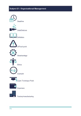 Subject E1: Organisational Management Deadline Debt/Debtors Definition Difficult point Disadvantage Ethics Example Exam Technique Point Expenses Factory/manufacturing P6
