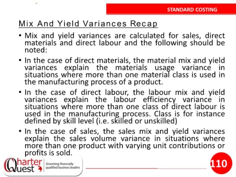 • Mix and yield variances are calculated for sales, direct