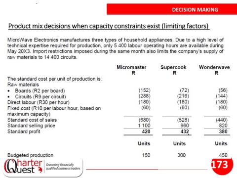 DECISION MAKING Product mix decisions when capacity constraints exist (limiting factors) 173