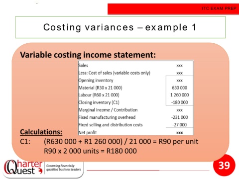 ITC EXAM PREP Costing variances – example 1 Variable costing income statement: Calculations: C1: (R630 000 + R1 260 000) / 21 000 = R90 per unit R90 x 2 000 units = R180 000 39