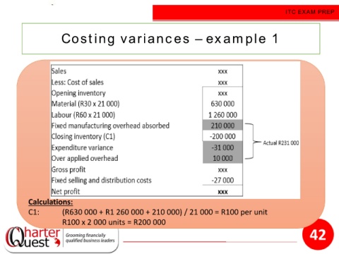 ITC EXAM PREP Costing variances – example 1 Calculations: C1: (R630 000 + R1 260 000 + 210 000) / 21 000 = R100 per unit R100 x 2 000 units = R200 000 42