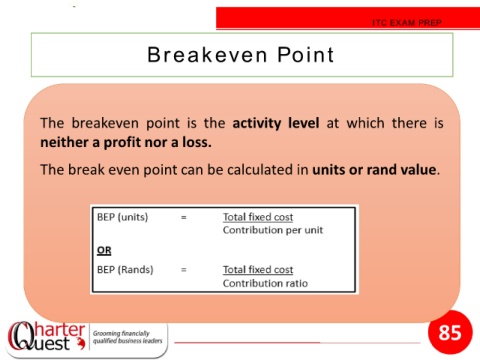ITC EXAM PREP Breakeven Point The breakeven point is the activity level at which there is neither a profit nor a loss. The break even point can be calculated in units or rand value. 85