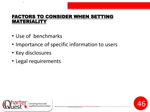 FACTORS TO CONSIDER WHEN SETTING MATERIALITY • Use of benchmarks • Importance of specific information to users • Key disclosures • Legal requirements 46 CharterQuest