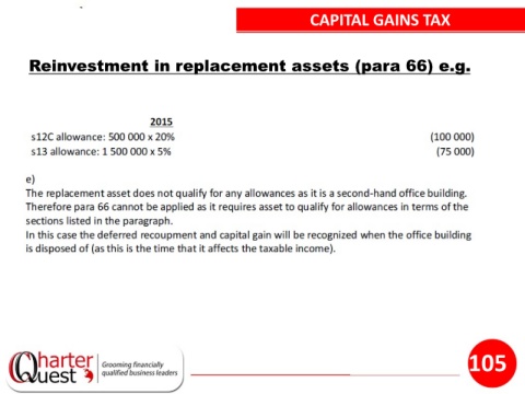 CAPITAL GAINS TAX Reinvestment in replacement assets (para 66) e.g. 105